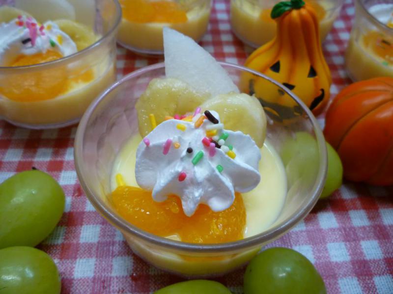 栄養課です10月のお菓子の日は、プリンにバナナや生クリームをトッピングして「バナナパフェ」を提供致しました。少しだけ、梨もついてます。