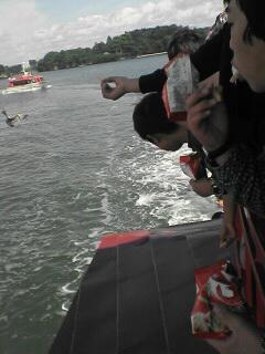 遊覧船が出港しました。塩釜までの船旅です。うみねこがすぐ近くを飛んでます。
