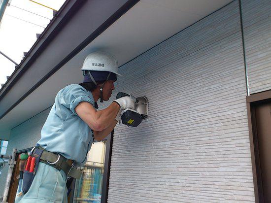 外壁工事も順調に進み電気屋さんが換気扇等のフードを取付けをおこなっております。