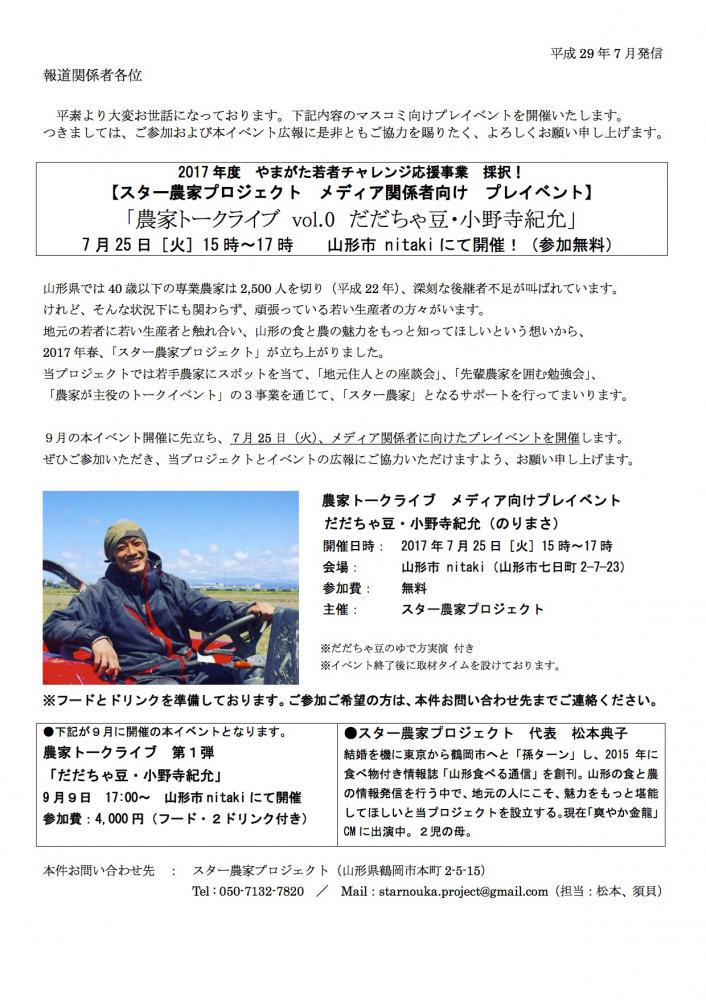 平成29年6月より、スター農家プロジェクトが始動しました!◆スター農家プロジェクトとは??◆県内の若手農家さんにスポットを当て、「地元住民との座談会」「先輩農家を囲む座談会」「農家が主役のトークイベント」の3事業を展開していきます。今回、その中の「農家が主役のトークイベント」のプレイベントの参加者を募集します。9月の本イベントに向けて一緒に、このプロジェクトを応援してくださる方、一緒に盛り上げてくださる方、大歓迎です。■日時:2017/7/25(火)15:00〜17:00■場所:山形市 nitaki  (山形市七日町2-7-23)■参加費:無料■申込方法:starnouka.project@gmail.com 迄メールにてお申込ください。      (担当:松本・須貝)