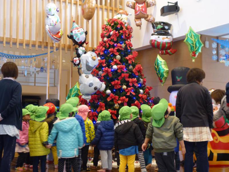 12月21日は、今年最後の保育園の訪問日です。本日来荘したのは、朝日町にあるあさひ保育園の3歳と5歳の子供たちです。はじめに3歳の子供たちがクリスマスツリーと一緒に写真を撮りに来ました。大きなツリーに興味深々な子供たちは、ツリーを囲んで楽しそうにおしゃべりしていました。その後施設内を探検し、事務室・厨房・医務室など見て回りました。3歳児が帰った後、入れ替わりで5歳の子供たちが来てお遊戯の披露をしてくれました。お歌を1曲歌った後、手遊び歌の「幸せなら手をたたこう」を入居者さんを交えてみんなで行いました。「手をたたこう」の部分を「ほっぺさわろう」「だっこしよう」と変えた歌に合わせて動作を交えながら遊びました。いつもは笑顔が少ない入居者さんが満面の笑顔で子供たちと触れ合う様子に驚き、嬉しくなりました。あさひ保育園の皆さん、先生方、本当にありがとうございました。 12月に5つの保育園訪問を受け、合計270名の子供たちが遊びに来ました。1番に感じたのは「子供たちのパワー」です。子供たちの声や姿を聞く・見るだけで、自然に笑顔になる入居者さんを見ると子供たちの影響力を実感します。12月来てくれた保育園の皆さんありがとうございました。またおじいちゃんおばあちゃんに元気を届けに来てくださいね!