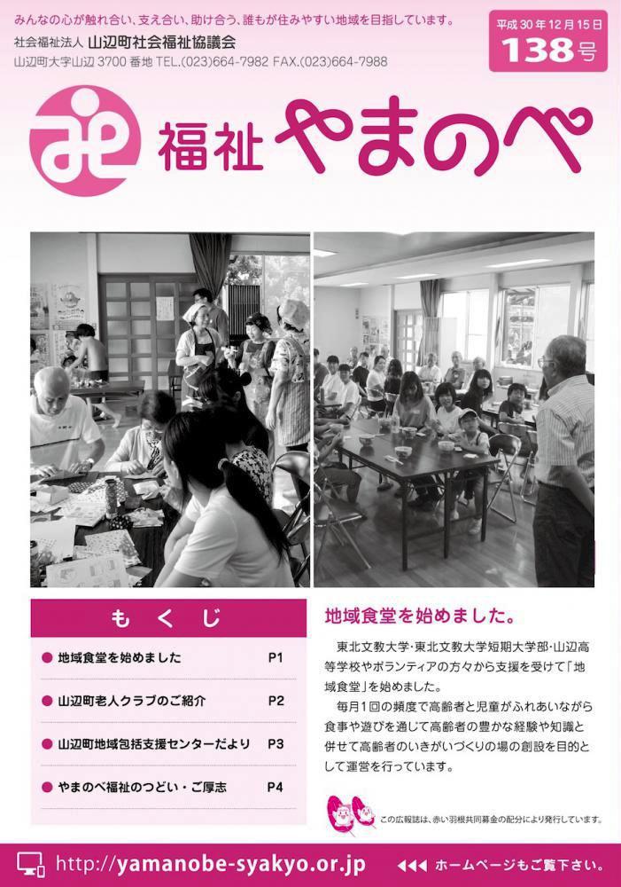 地域食堂の実施や、山辺町老人クラブについて、山辺町地域包括支援センターより「認知症サポーター」について、やまのべ福祉のつどいやご寄付の内容を掲載しております。山辺町では10クラブの老人クラブが活動しており、会員を募集しております。どうぞお気軽にお問い合わせ下さい。→ 山辺町社会福祉協議会・広報誌138号(PDF)