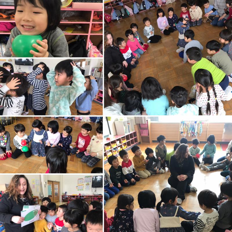 英語でのいろんな色の言い方を覚えたり、風船を使ったゲームをしたりと、