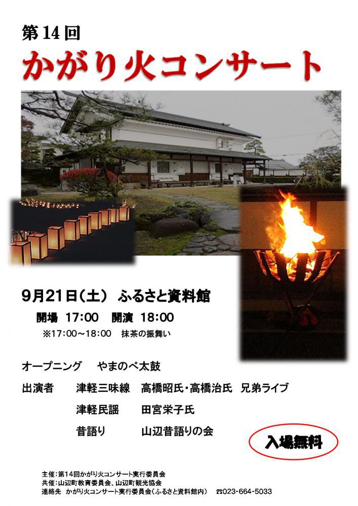 ふるさと資料館にて、「かがり火コンサート」を開催します。今年で14回目となる「かがり火コンサート」では、津軽三味線の演奏や津軽民謡、昔語り会などが行われます。秋の夜長にかがり火の灯りの下で、幻想的な時間を過ごしてみませんか! 第14回かがり火コンサート□日 時 令和元年9月21日(土)□場 所 ふるさと資料館中庭□時 間 17:00開場 18:00開演 ※17:00〜18:00 抹茶の振舞い□入 場 無料□お問合せ先 第14回かがり火コンサート実行委員会 (ふるさと資料館内) TEL:023−664−5033