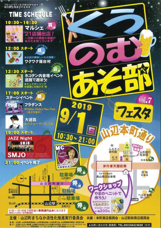 今年で7回目となる「くう・のむ・あそ部(べ)」フェスタを9月1日(日)に本町通りにて開催します。本町通りの一部が歩行者天国になり、道路にお絵かきや、キックボーリング等普段では遊べない道路でおもいっきり遊べます(^o^)/ステージイベントが開催されるほか、山辺のおいしい物の屋台や、マルシェも開かれます♪9月1日は山辺町で食べて、飲んで、遊んで、楽しい時間を過ごしにきてください!!  「くう・のむ・あそ部(べ)フェスタ」vol.7□日  時   2019年9月1日(日)□時  間   10:30〜21:00□場  所   山辺本町通り□スケジュール  10:30〜16:30   マルシェ            12:00〜        屋台村            12:30〜        道路で遊ぼう!            17:00〜        ステージイベント            21:00          イベント終了□主  催    山辺町まちなか活性化推進実行委員会□お問合せ先  事務局 TEL:023−664−5620