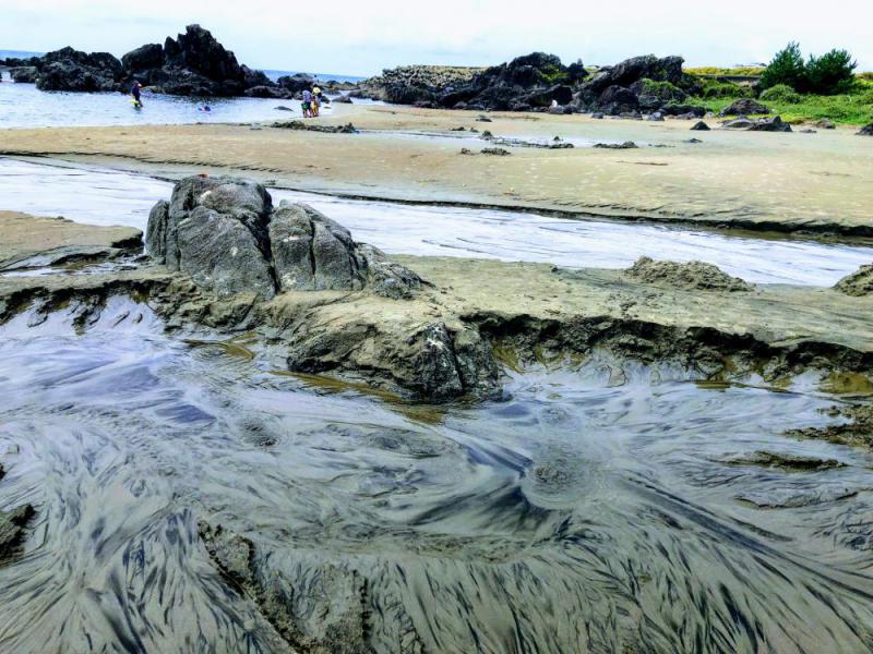 鳥海山からの湧水が日本海の砂浜からボコボコ湧き出る奇跡的なスポット。鳥海山からの伏流水は砂浜から湧き出し海へと流れ砂を削りながらアートな紋様を描き出しています。釜磯海水浴場では海なのに「真水/淡水」の湧水スポットをあちこち楽しめます。
