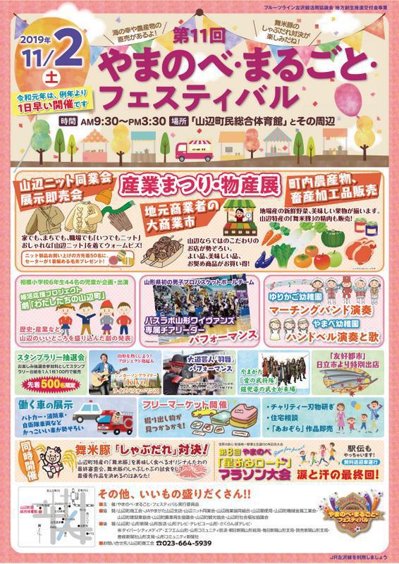 今年の「やまのべ・まるごと・フェスティバル」は11月2日(土)に開催します。町の農産物販売、やまのべニット製品の即売会や、友好都市の日立市より海の幸等が出店されます。美味しい物、めずらしい物、お得な品物が勢ぞろい!!町内の園児や小学生によるステージイベントの開催や、子供達に大人気の働く車の展示、豪華賞品が当たるスタンプラリー大抽選会等もあり、山辺町の魅力をまるごと味わえる一日となってます(^o^)/ また、今年は舞米豚の「しゃぶだれコンテスト」を開催します。受付時間内に、舞米豚に関するクイズに答えると最終審査に残った3作品が全て食べられます。一番美味しいと思う作品に投票してください。最優秀作品は皆さまの投票で決まります!! クイズで知ろう!食べよう!舞米豚【しゃぶだれコンテスト】 □場 所 中央公園中央広場南側(舞米豚ブース) □参加費 無料 □受付時間 午前10時〜11時、11時〜正午、正午〜午後1時、 1時〜1時50分(最終のみ50分間)毎に先着100人まで □結果発表 午後2時〜 □お問合せ 「しゃぶだれコンテスト」事務局(産業課商工観光係) なお、同時開催の第8回「星ふるロード」マラソン大会は今年で最終回となります。選手の皆さんにたくさんの応援を送りましょう!! 11月2日は、やまのべ・まるごと・フェスティバルにぜひお越しください(^^)/ 第11回やまのべ・まるごと・フェスティバル □日 時 令和元年11月2日(土) □時 間 AM9:30〜PM3:30 □場 所 山辺町民総合体育館とその周辺 □お問合せ 山辺町商工会 電話:023-664-5939
