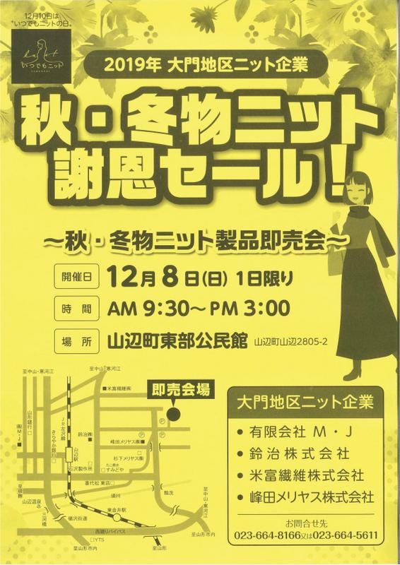 山辺町大門地区にあるニット企業4社による秋・冬物ニット製品即売会を12月8日(日)に1日限りで行います。即売会では、首都圏の百貨店等のも納品されている高品質なニット製品を工場直売価格で販売されます。これからニットが活躍する季節です。セーター・カーディガン・ジャケット等お得にお買い求めるチャンスです!! 秋・冬物ニット謝恩セール!□場 所 山辺東部公民館(山辺町山辺2805-2)□開催日 2019年12月8日(日)□時 間 AM9:30〜PM3:00□お問合せ先 023−664−8166又は023−664−5611