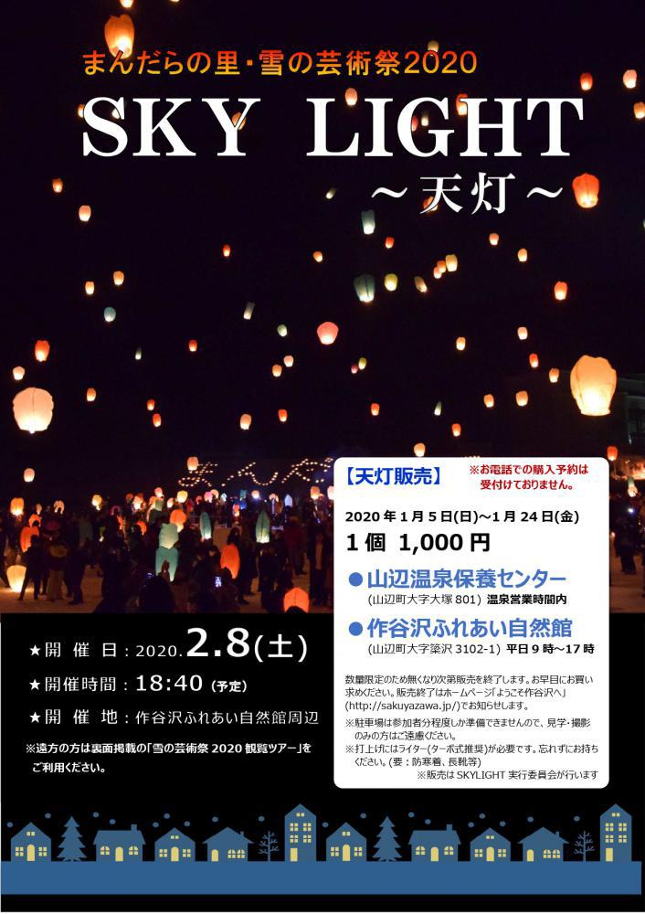 まんだらの里・作谷沢の冬のイベント「雪の芸術祭2020」を開催します。一面銀世界となる作谷沢ふれあい自然館にて様々なイベントが行われます。屋外イベントとして天灯(スカイライト)の打ち上げを行います。作谷沢の澄んだ夜空に、一緒に天灯を打ち上げる参加者を募集します!色とりどりの天灯が空一面に浮かび上がり幻想的な世界が広がります。ご友人やご家族、大切な人と一緒に願いを込めて天灯を打ち上げてみませんか!!また、天灯がセットになった「雪の芸術祭2020観覧ツアー」を開催します。雪道の運転に不安な方や、交通手段が無い方からも安心してご参加いただけます。 『雪の芸術祭2020』☆開 催 日 2020年2月8日(土) 18:40(予定)☆場 所 作谷沢ふれあい自然館周辺☆参 加 費 天灯(スカイライト)1個1,000円☆天灯販売 2020年1月5日(日)〜1月24日(金) 山辺温泉保養センター (温泉営業時間内) 作谷沢ふれあい自然館 (平日9時〜17時) ※数量限定のため無くなり次第終了します。お早目にお買い求めください。販売終了はホームページ「ようこそ作谷沢へ」でお知らせします。 ※打上げにはライター(ターボ式推奨)が必要です。忘れずにお持ちください。(要:防寒着、長靴等)『雪の芸術祭2020観覧ツアー』 ☆旅行期間 2020年2月8日(土)日帰り ☆旅行代金 (大人2名様)10,000円(税込)※往復送迎バス2名様分・天灯1個付き ☆申込み期間 2020年1月6日(月)〜1月24日(金) ☆申込み先 株式会社JTB山形支店 TEL023-641-9500(9:30〜17:30・土日祝休業) ※先着80名様限定になります。(要電話申込み)定員になり次第締め切らせて頂きます。 ※行き:山形駅東口発16:00、帰り:作谷沢発19:30(乗車時間は50分程度) ☆お問合せ先 作谷沢ふれあい自然館 山辺町大字簗沢3102−1 TEL 023−666−2121