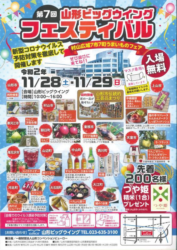 11月28日(土)・29(日)に山形ビックウイングフェスティバルが行われます。村山広域の7市7町のうまいものが勢ぞろいします。山辺町からは、「喜代松さん」のアップルパイやチーズパイなどが出展されます。各市町村のうまいものを一堂にお楽しみください。また、先着200名様につや姫(1合)をプレゼントします。同時にやまがたパンマルシェも開催します。 第7回山形ビックウイングフェスティバル日 時:令和2年11月28日(土)・29日(日)時 間:10:00〜16:00会 場:山形ビックウイング ご来場の際はマスク着用をお願いします。