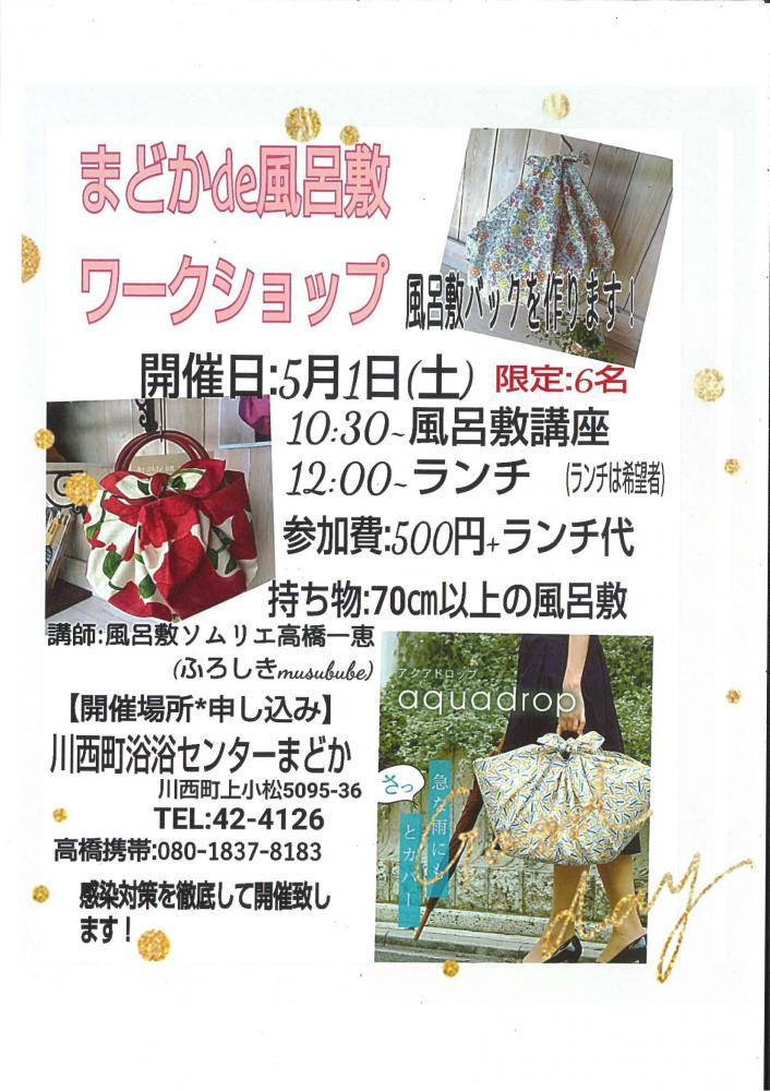 まどかde風呂敷ワークショップ※風呂敷バックを作ります♪開催日5月1日(土)限定6名10:30〜風呂敷講座12:00〜ランチ(希望者)参加費:500円+ランチ代持ち物:70cm以上の風呂敷開催場所:お申込み川西町浴浴センターまどかTEL0238-42-4126※感染症対策を徹底して開催いたします!!ごりそうギフトの風呂敷が70cmなので、こちらご利用の方もぜひご参加お待ちいたしております。