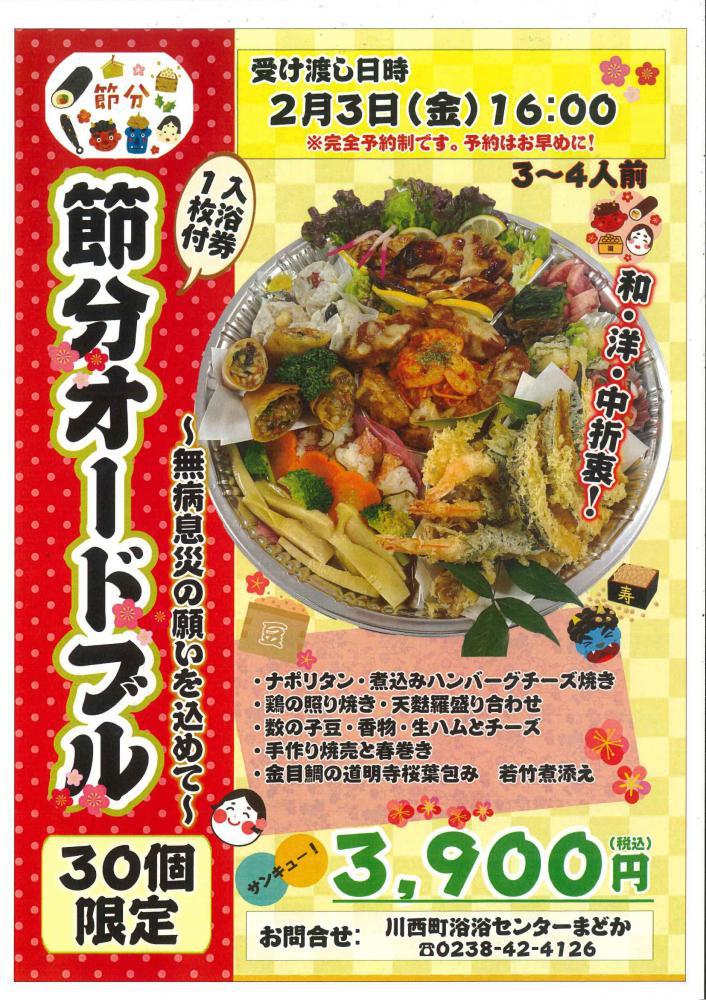 〜まどか節分オードブル〜受け渡し日時:2月3日(金)16:00※予約制 30個限定・・・3900円税込 3〜4人前 入浴券1枚付き☆内容:ナポリタン・煮込みハンバーグチーズ焼き    鶏の照り焼き・天麩羅盛り合わせ    数の子豆・香物・生ハムとチーズ    手作り焼売と春巻き    金目鯛の道明寺桜葉包み 若竹煮添え ★お問い合わせ・予約★  浴浴センターまどか TEL:0238-42-4126