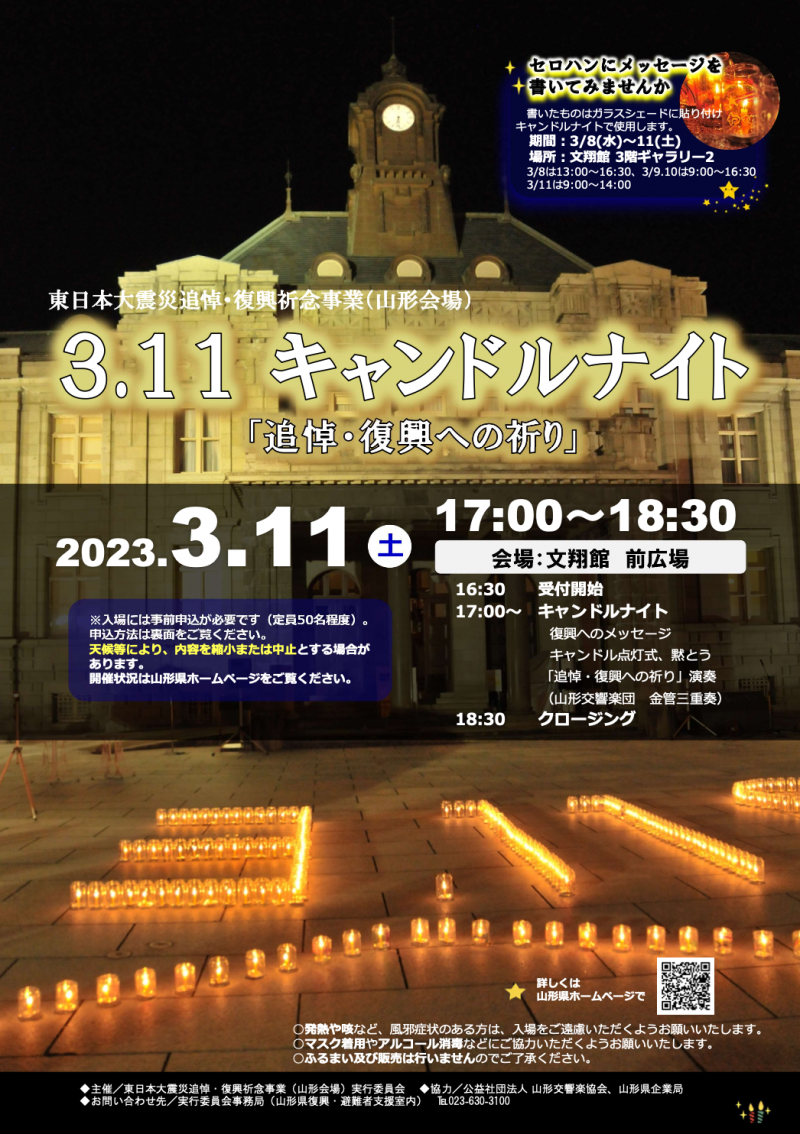 山形市の文翔館で今年も3.11キャンドルナイトが開かれます。残念ですが今回もキャンドルを作っての献灯はありません。50人を目処に予約制で行われます。参加ご希望の方は上記ダウンロードボタンよりチラシを開いて詳細をお確かめください。