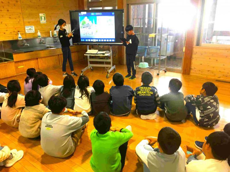 中間休みに、図書委員会による読み聞かせがありました。今年度2回目です。1階と2階に分かれ、タブレットでモニターに絵本を映し、読んでいきます。聞いている子供たちも、みんなとても真剣な表情でした。また、低学年、高学年用に、図書委員がお薦めの本も紹介されています。