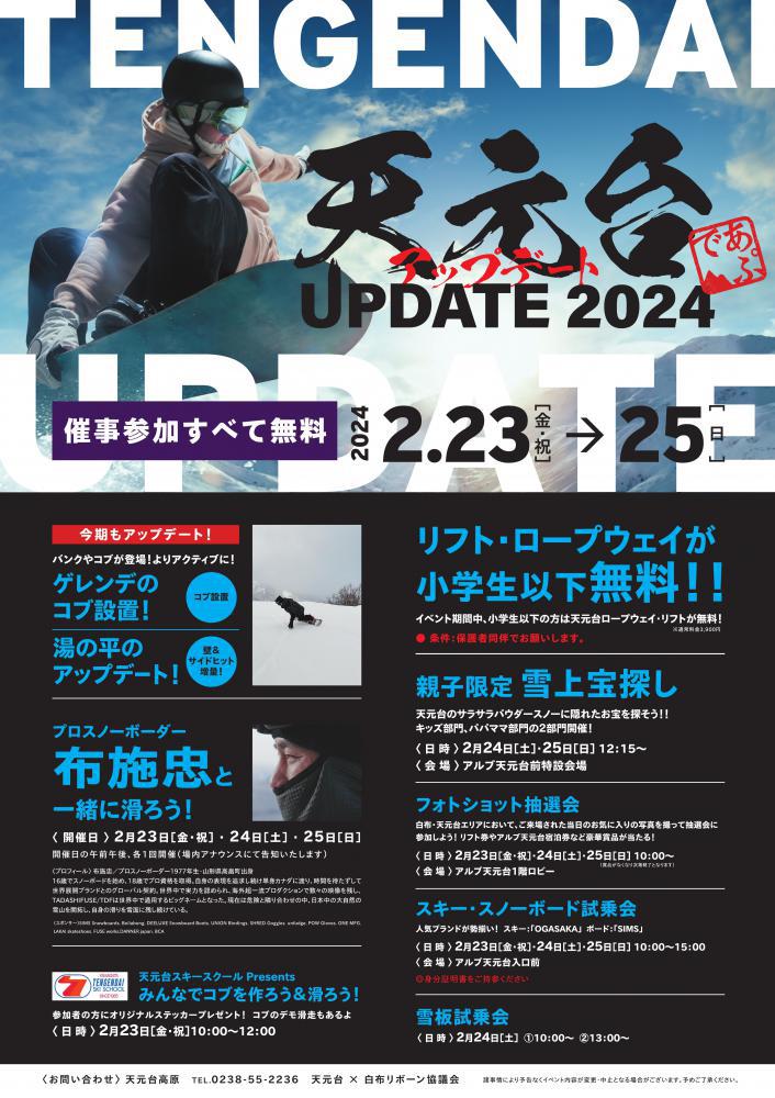 天元台はことしも アップデート!23〜25日の3連休は天元台高原に遊びに行きませんか?小学生以下はロープウェイ・リフトが無料!プロスノーボーダー布施忠さんと一緒に滑る企画など楽しい催しが盛りだくさん!催事参加すべて無料ですので、ぜひお越しください! ◇開催期間 2024年2月23日(金・祝)〜2月25日(日) ◆湯の平コースのアップデート!バンクやコブが登場!よりアクティブに! ◆プロスノーボーダー布施 忠氏と一緒に滑ろう!〈開催日〉2月23日(金・祝)24日(土)25日(日)※開催日の午前午後各1回開催(場内アナウンスにて告知いたします。) ◆イベント期間中、リフト・ロープウェイが小学生以下無料!※保護者同伴でお願いします。※通常料金3,900円 ◆親子限定雪上宝探し〜パウダースノーに隠れたお宝を探そう!〜キッズ部門、パパママ部門の2部門開催!〈日 時〉2月24日(土)・25日(日) 12:15〜〈会 場〉アルブ天元台前特設会場 ◆フォトショット抽選会〜リフト券やアルブ天元台宿泊券など豪華賞品が当たる!〜白布・天元台エリアにおいて、ご来場された当日のお気に入りの写真を撮って抽選会に参加しよう!〈日 時〉2月23日(金・祝)・24日(土)・25日(日) 10:00〜※賞品がなくなり次第終了となります。〈会場〉アルブ天元台1階ロビー ※その他のイベント、詳細は天元台ホームページをご覧ください。 【お問い合わせ】天元台 〒992-1461 米沢市白布温泉天元台 TEL:0238-55-2236