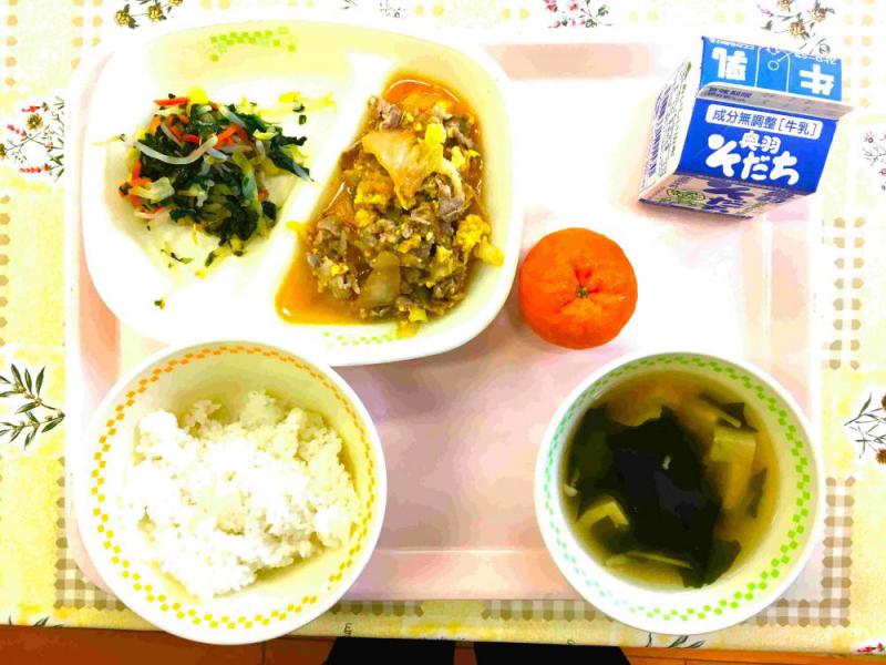 2月15日の給食は、6年生が考えた「二小めざみっこデー」でした。メニューは・・・豚キムチ炒め、磯香和え、わかめとコーンのスープ、ポンカン、ごはん、牛乳でした。メニューを考えた6年生はもちろん、各教室でもおいしそうに食べる姿が見られました。体も心も温まるおいしいメニューでした。6年生のみなさん、ごちそうさまでした。