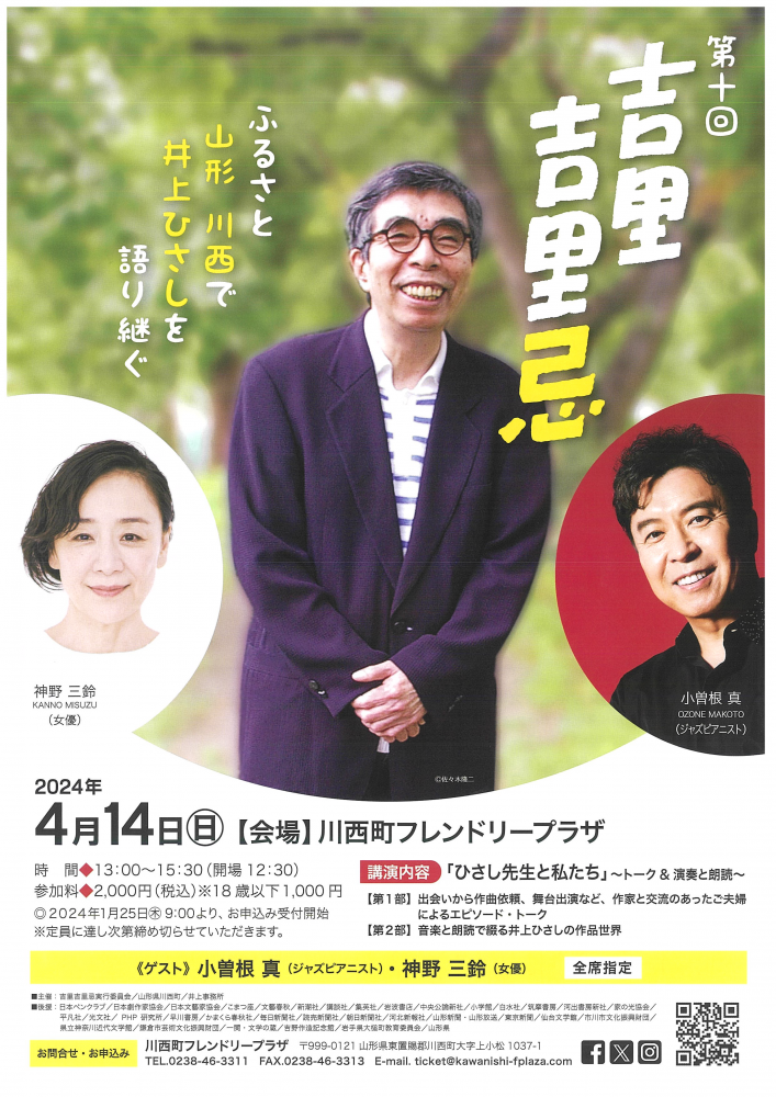 川西町フレンドリープラザにて、「第十回 吉里吉里忌」が開催されます。ゲストに、ジャズピアニストの小曽根 真氏、女優の神野 三鈴氏を迎え、川西で井上ひさしを語り継ぎます。この機会にぜひ、ご来場ください。<日時>令和6年4月14日(日)13:00〜15:30(12:30開場)<場所>川西町フレンドリープラザ<入場料>2,000円※18歳以下1,000円<問い合わせ>川西町フレンドリープラザ 0238−46−3311詳細はコチラ