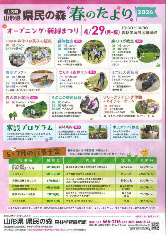 4月29日(月・祝)の午前10時〜午後2時30分まで県民の森 森林学習展示館周辺にて、県民の森オープニング・新緑まつりが開催されます。ツリークライミング体験やきのこの植菌体験、こいのぼりのペンダント作りやミニSL大運動会など楽しいイベントが盛りだくさんです。その他にも森のヨガ教室や森の森林案内など無料で参加できるイベントもたくさんございます。山辺高校生の手作りお菓子の販売もございますが、なくなり次第終了となりますので、ぜひお早めにお越しください。