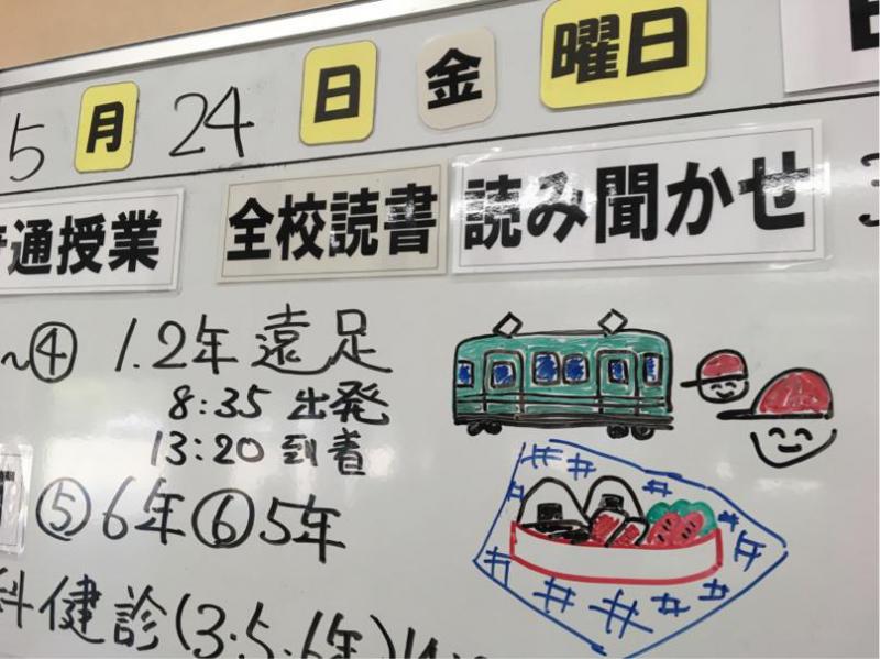 8時30分、学校を出発しました。天気がよくて、絶好の遠足日和です。今泉駅で、最初の記念撮影です。