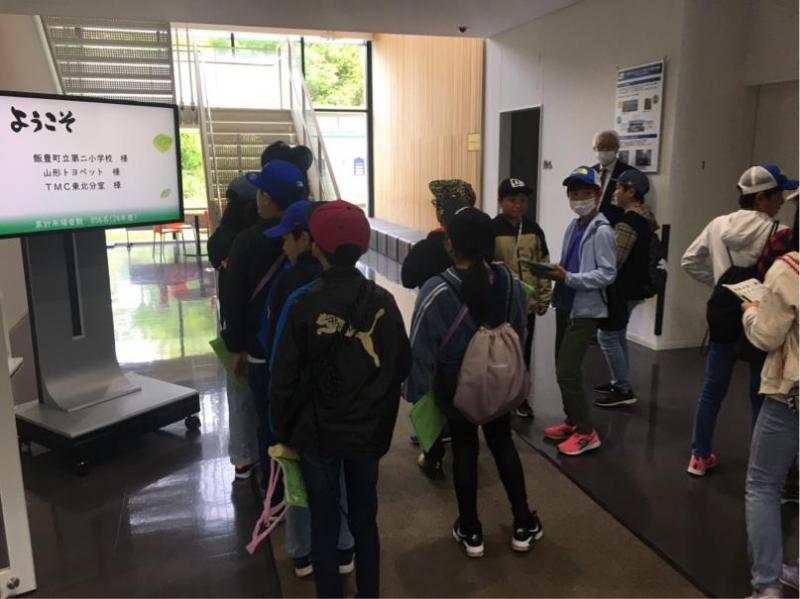 9時になりました。最初の見学地、トヨタ工場です。まずは係の方から説明をお聞きします。みんな、真剣に画面を見てメモをとっています。この後の工場内は、撮影禁止です。