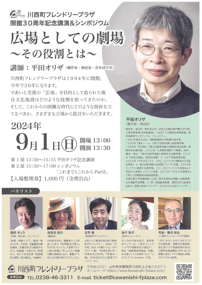 川西町フレンドリープラザは、1994年に開館し、今年で30年になります。その節目の年に、劇作家である平田オリザ氏を講師に迎え、5名のパネリストと共に、であいと交流の「広場」を目的に造られた文化施設がどのような役割を担ってきたのか、そして、これからの時代にどのような指針を立てるべきかを考えます。<日時>令和6年9月1日(日) 開場13:00 開演:13:30<場所>川西町フレンドリープラザ<講師>平田オリザ(劇作家・演出家・青年団主宰)<パネリスト>渡部ギュウ(役者・演出者・ナレーター)鳥兎沼佳代(編集者)庄司勉(映像制作ディレクター)金子聡子(絵本キュレーター)栗田政弘(川西町フレンドリープラザ館長)<料金>1,000円(全席自由)<問い合わせ>川西町フレンドリープラザ0238-46-3311詳細は、チラシをご覧ください。