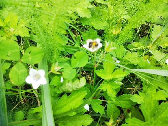 天元台高原ゲレンデに目をやるとウメバチソウがあちこちに咲いてます・ウメバチソウは北半球の温帯から亜寒帯に分布し、日当たりのよい湿地、山地の水がしみ出るような斜面に見られる多年草です。秋に、白いウメのような花を茎の先端に1輪咲かせます。花弁はウメの花弁に似てることから名が付く、秋の花、ミツバチが蜜吸ってました・・