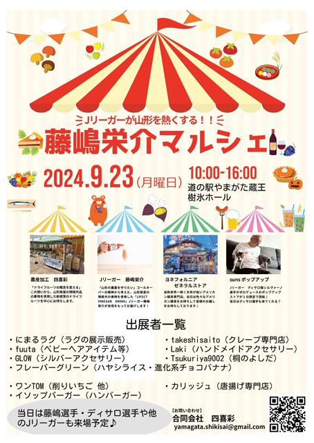 藤嶋栄介マルシェが開催されます。日時 9月23日(月) 10時〜16時場所 道の駅やまがた蔵王樹氷ホール出店者 ・にまるラグ(ラグの展示販売)・fuuta(ベビーヘアアイテム等)・GLOW(シルバーアクセサリー)・フレーバーグリーン(ハヤシライス、進化系チョコバナナ)・takeshisaito(クレープ専門店)・Laki(ハンドアクセサリー)・Tsukuriya9002(桐のよしだ)・ワンTOM(削りいちご 他)・カリッジュ(唐揚げ専門店)・イソップバーガー(ハンバーガー)当日は藤嶋選手・ディサロ選手や他のJリーガーも来場予定みたいです。Jリーガーが山形を熱くする?すごい熱いワード、ちょっと自分も行ってみようかな〜