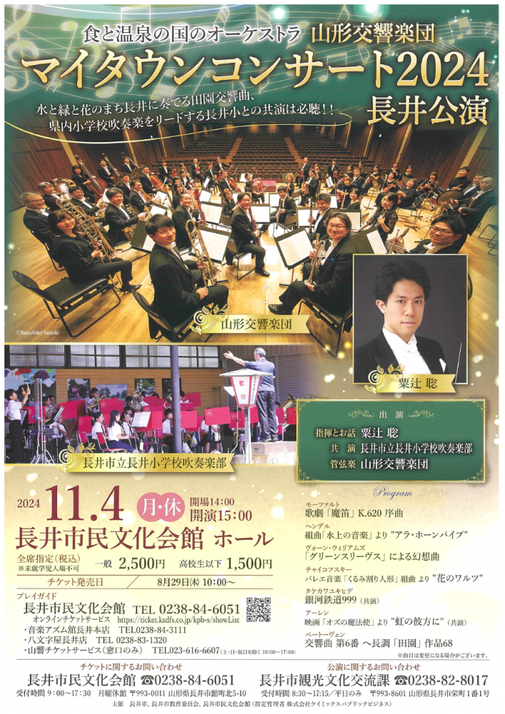 長井市民文化会館にて、山形交響楽団マイタウンコンサート2024長井公演が開催されます。粟辻聡氏の指揮のもと、山形交響楽団が長井市立長井小学校吹奏楽部と共演します!水と緑と花のまち長井に奏でる田園交響曲、県内小学校吹奏楽をリードする長井小学校との共演は必聴です!ぜひ、ご来場ください。<開催日時>令和6年11月4日(月・休)開演15:00(開場14:00)<場所>長井市民文化会館ホール<料金>全席指定(税込)一般2,500円高校生以下1,500円<お問い合わせ>チケットに関すること:長井市民文化会館 0238-84-6051公演に関すること:長井市観光文化交流課 0238-82-8017詳細はチラシをご覧ください。