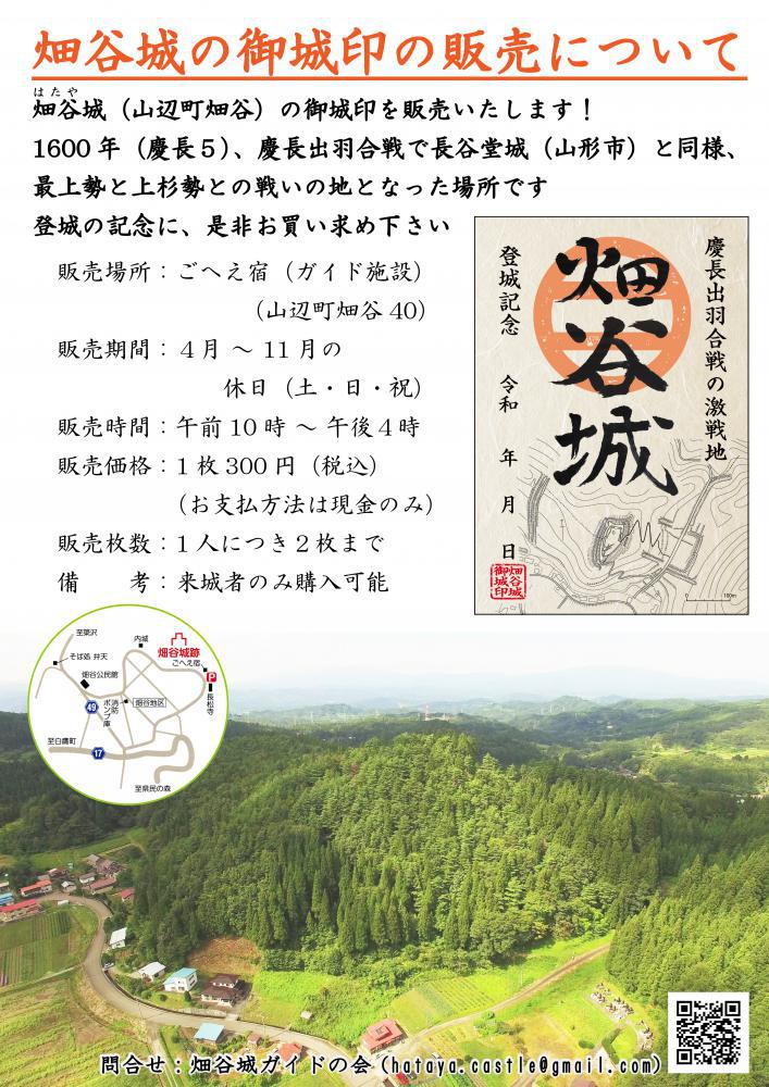 4月26日より畑谷城にて「御城印」が販売されます!縄張り図も描かれた珍しいデザインの御城印で、来城者の方のみ購入できます。 販売場所:ごへい宿(山辺町畑谷40)販売期間:4月〜11月の土・日・祝日販売価格:1枚 税込300円(お支払いは現金のみ) ※休日以外の日に来城された方で、購入を希望される場合は郵送対応での販売となります。お問合せ:畑谷城ガイドの会(hataya.castle@gmail.com)
