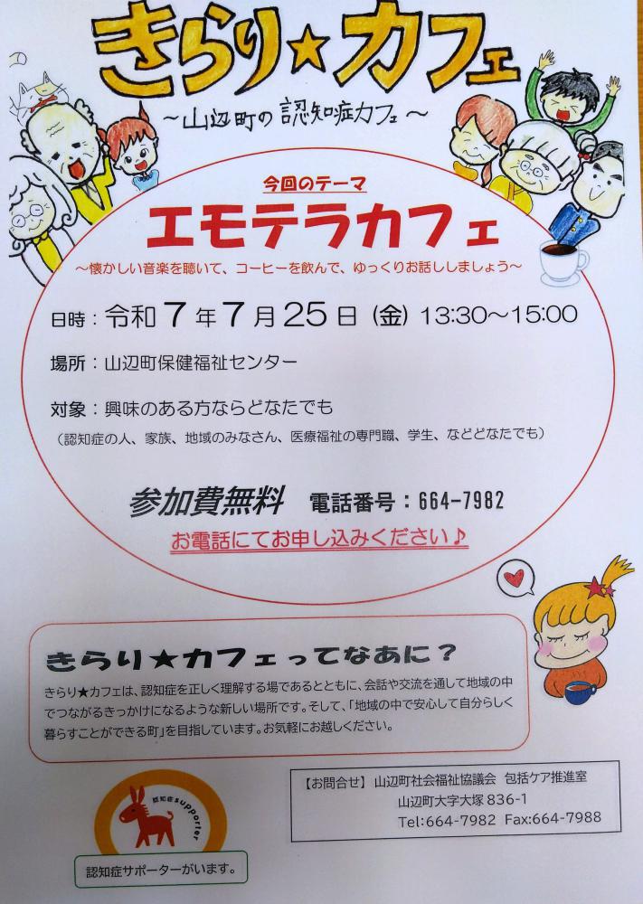 認知症の方、介護や認知症に関心のある方ならどなたでも参加でき、みんなが気軽に立ち寄れる「つながり」と「きっかけ」ができる新しい場所です。・日時/令和7年7月25日(金)午後1時30分〜3時00分・内容/「エモテラカフェ」〜懐かしい案額を聴いて、コーヒーを飲んで、ゆっくりお話ししましょう〜・場所/山辺町保健福祉センター・対象者/関心のある方ならどなたでも・参加費/無料【事前に申し込みが必要です】申込問合せ 山辺町社会福祉協議会 電話(664)7982