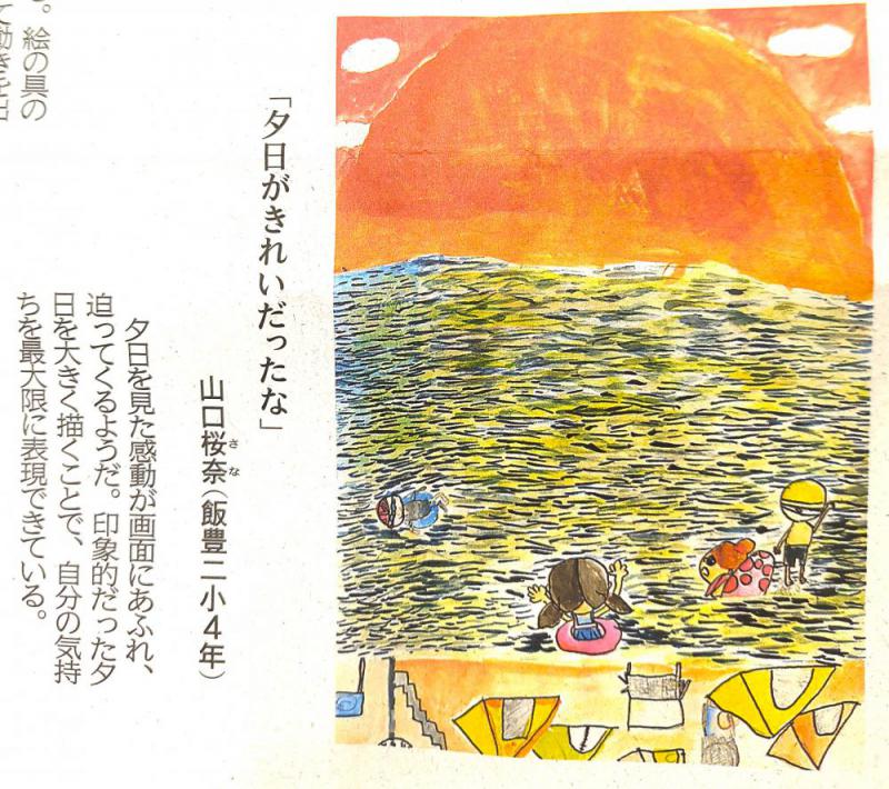 本日配付の学校だよりでもお知らせしましたが、子ども県展において、9名の児童が入選する素晴らしい結果となりました。中でも、4学年児童が、各学年の最高賞である「県展賞」をいただきました。画像は新聞のものですが、自分が感じたであろう生き生きとした感覚が伝わってきます。その時、その一瞬の思いを絵に描けることが素晴らしいですし、この時代だからこそ大切にしてほしいと思いました。
