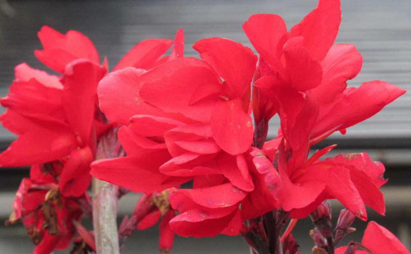 ●散歩の途中で真っ赤に咲いている「カンナ」を目にしました 鮮やかな赤い花で真夏を思わせるような花ですが開花時期は6月から今頃の10月まで咲き続ける花のようです 大きな葉の間から鮮やかな花を咲かせるそうですがそばに黄色の花も咲いていました 白やピンクオレンジ等花色も変化に富み背丈も大きくなるそうです きれいですが我が家の狭い庭では植えることのできない花で他所の庭で鑑賞させてもらうしかありません