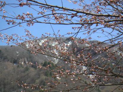 三百坊の西行歌碑周辺には、5月になると桃色が濃い生命力みなぎる桜「大山桜」が咲き誇ります。権現堂のふりそで桜などは必見。
